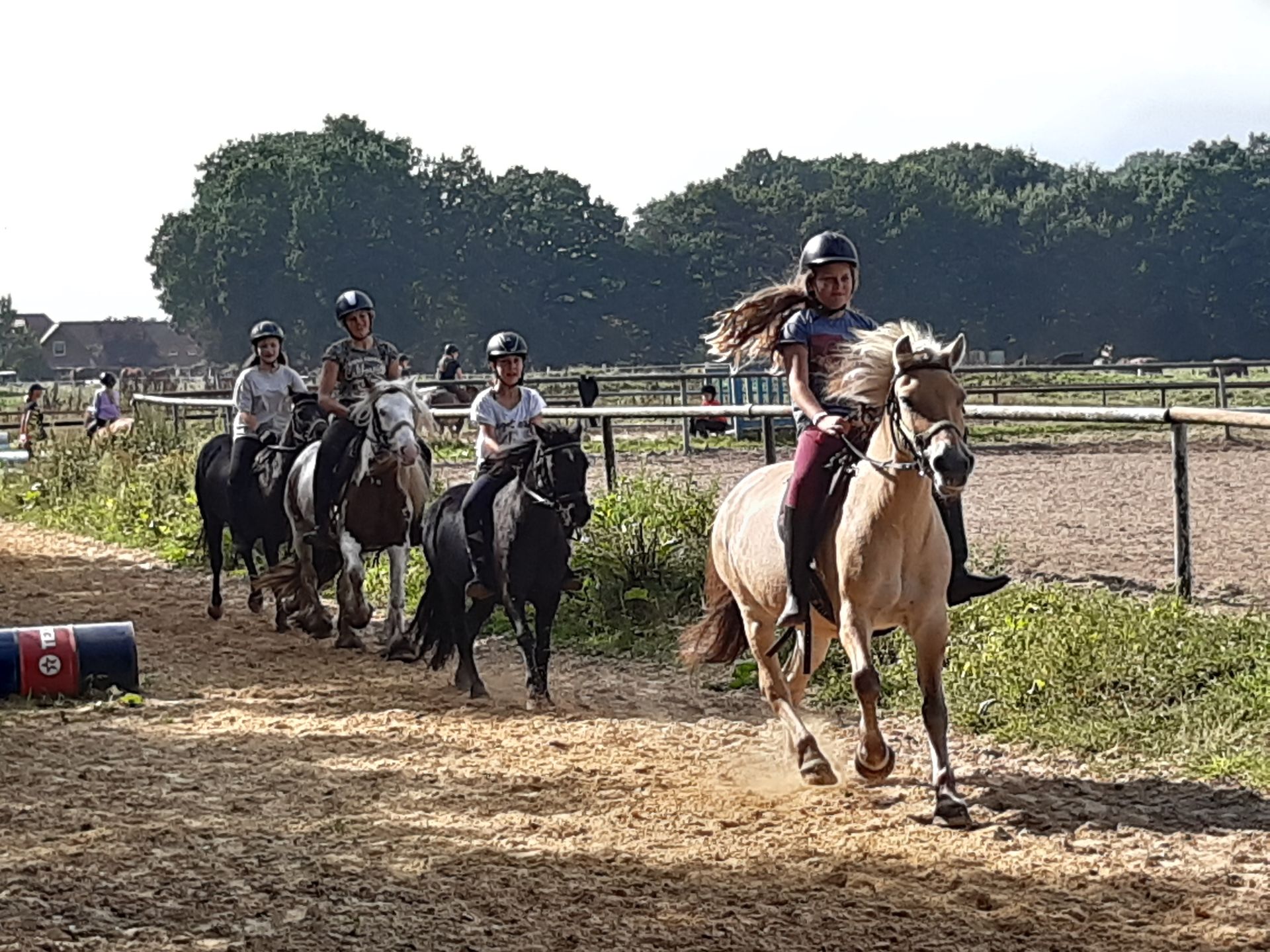 Nach dem Frühstück und dem Mittagessen können die Kinder entscheiden, an welcher der sechs Reitaktionen sie teilnehmen möchten. Hier kann zwischen Anfänger- und Fortgeschrittenenreitstunde, freiem Reiten unter Aufsicht (z.B. um Gelerntes zu vertiefen), Voltigieren und langsamer oder schneller Ausritt gewählt werden. Springstunden werden wir nicht haben.